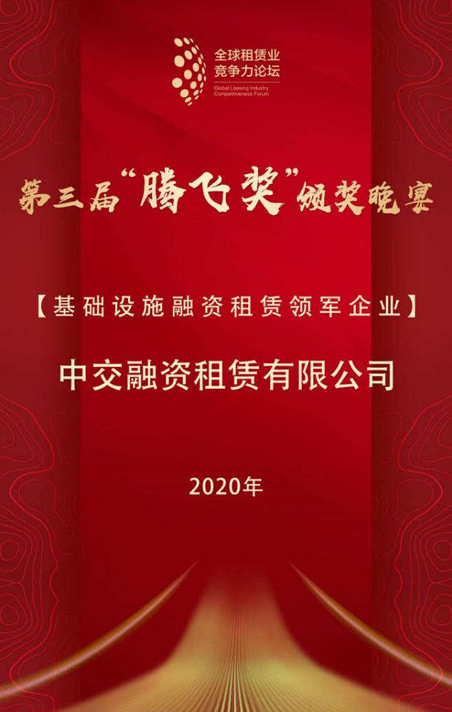 11月4日,2020(第七届)全球租赁业竞争力论坛在天津举行。在此次论坛上,中交租赁荣获“第三届腾飞奖——基础设施租赁领军企业”。