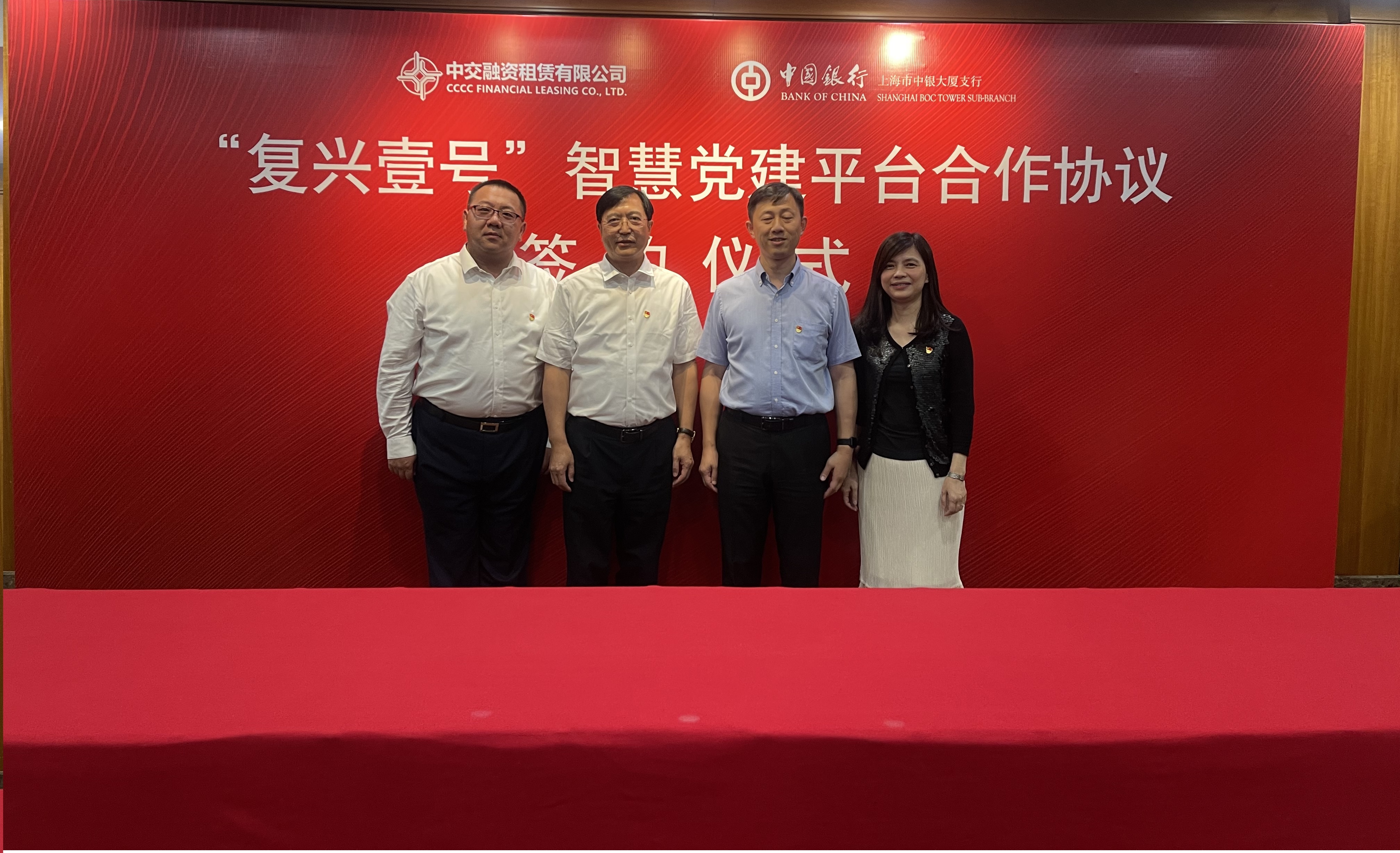 为迎接建党百年华诞,深入开展党史学习教育,推进党建业务融合发展,6月23日下午,中交租赁机关第二党支部与中国银行上海市中银大厦支行党支部共同组织“党建共建聚合力、共享共进见实效”活动,并签署“复兴壹号”智慧党建平台合作协议。公司党委书记、董事长张剑兴,中国银行上海市分行党委委员、副行长张欣园,公司党委副书记、总经理李青岸,副总经理、总会计师、总法律顾问钱鎔出席活动。