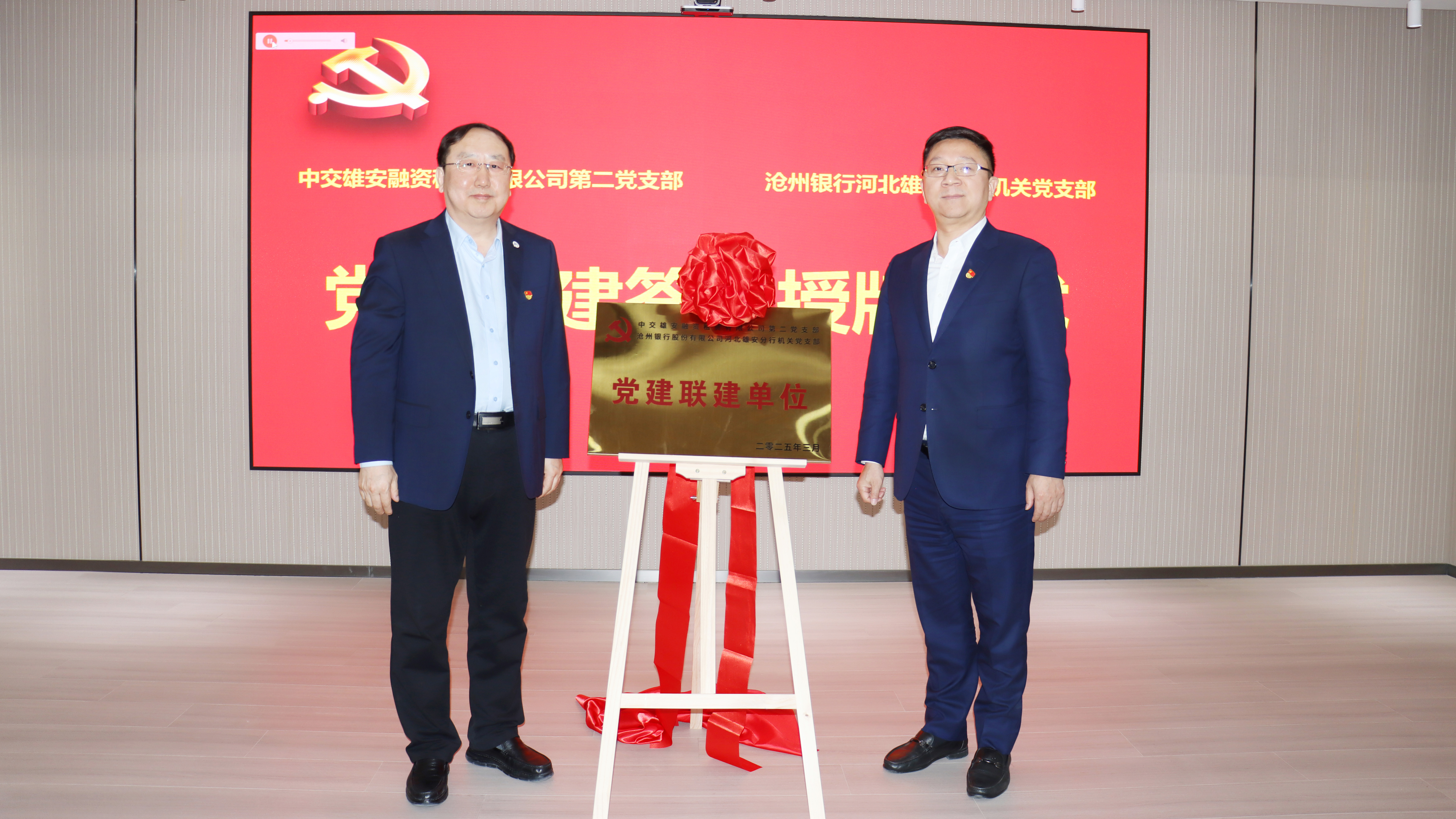 3月5日,公司与沧州银行河北雄安分行开展党建联建签约揭牌活动。沧州银行河北雄安分行党委书记、行长韩云峰,党委委员、副行长秦亚宾,党委委员、副行长臧洪彬,党委委员、纪检组长李桂红,党委委员、行长助理魏大鹏,公司党总支书记、董事长王荆洲,党总支副书记、执行总经理刘景彦,副总经理、总会计师王凯出席活动。